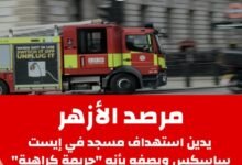 الازہر آبزرویٹری نے ایسٹ سسیکس میں مسجد پر حملے کی شدید مذمت کی اور اسے “نفرت انگیز جرم” قرار دیا