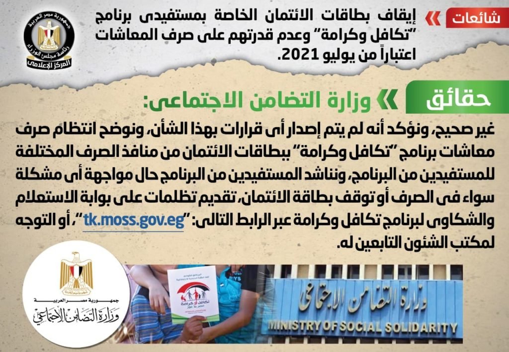 انتشر في بعض المواقع الإلكترونية وصفحات التواصل الاجتماعي أنباء بشأن إيقاف بطاقات الائتمان الخاصة بمستفيدي برنامج “تكافل وكرامة” وعدم قدرتهم على صرف المعاشات اعتباراً من يوليو 2021، وقد قام المركز الإعلامي لمجلس الوزراء بالتواصل مع وزارة التضامن الاجتماعي، والتي نفت تلك الأنباء، مُؤكدةً أنه لا صحة لإيقاف بطاقات الائتمان الخاصة بمستفيدي برنامج “تكافل وكرامة” وعدم قدرتهم على صرف المعاشات اعتباراً من يوليو 2021، وأنه لم يتم إصدار أي قرارات بهذا الشأن، مُوضحةً انتظام صرف معاشات برنامج “تكافل وكرامة” ببطاقات الائتمان من منافذ الصرف المختلفة للمستفيدين من البرنامج، مُناشدةً المستفيدين من البرنامج حال مواجهة أي مشكلة سواء في الصرف أو توقف بطاقة الائتمان، تقديم تظلمات على بوابة الاستعلام والشكاوى لبرنامج تكافل وكرامة عبر الرابط التالي: “tk.moss.gov.eg”، أو التوجه لمكتب الشئون التابعين له.