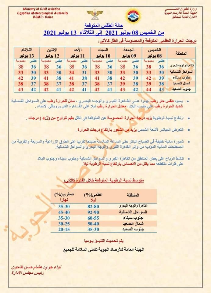 أوضحت الهيئة في بيانها أن البلاد ستشهد طقسا مائلا للحرارة على السواحل الشمالية حارا رطبا على القاهرة والوجه البحري، وشديد الحرارة على جنوب البلاد وجنوب سيناء، نهارا، معتدلا ليلا.