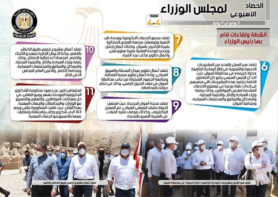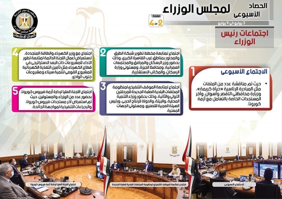 نشر المركز الإعلامي لمجلس الوزراء، تقريراً شمل إنفوجرافات سلط من خلالها الضوء على الحصاد الأسبوعي لمجلس الوزراء، وذلك خلال الفترة من 3 حتى 9 يوليو 2021، والذي تضمن الموافقة على عدد من القرارات، فضلاً عن الاجتماعات التي عقدها الدكتور مصطفى مدبولي، رئيس مجلس الوزراء، بالإضافة إلى ما قام به من أنشطة.