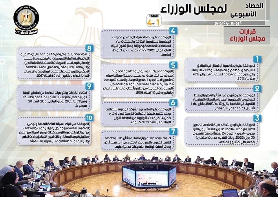 وجاء في التقرير أنه تم إصدار عدد من القرارات، تشمل الموافقة على زيادة نسبة الإشغال في الفنادق السياحية والمطاعم والكافيهات، وكذلك السينمات والمسارح وخلافه بطاقة استيعابية تصل إلى 70% بدلاً من 50، فضلاً عن الموافقة على مشروع قرار بشأن الاتفاق المبسط الموقع بين الحكومة المصرية والوكالة الفرنسية للتنمية، فى القاهرة بتاريخ 13/6/2021، بشأن إعادة تأسيس الجامعة الفرنسية بمصر، بالإضافة إلى الموافقة على الإذن بتعاقد هيئة المتحف المصري الكبير مع مكتب “المهندسون الاستشاريون العرب محرم – باخوم”، لمدة 24 شهراً إضافية تنتهي فى 30 إبريل 2022، وذلك لتقديم خدمات استشارية كدعم فني لمشروع المتحف، وكذلك الموافقة على زيادة الاعتماد المخصص للحملات الإعلامية لمنظومة النظافة والمخلفات من الاعتمادات المخصصة بموازنة جهاز شئون البيئة للعام المالي 2021/2022 دون طلب أي اعتمادات إضافية، إلى جانب الموافقة على قيام الهيئة العامة لنظافة وتجميل القاهرة بالتعاقد مع مقاول رفع التراكمات والمخلفات من مناطق القاهرة الأربع، وكذلك توفير العمالة من خلال مقاولي توريد العمالة، وذلك لحين انتهاء إجراءات الطرح والترسية للمناقصة العامة التي تقوم بها الهيئة.
