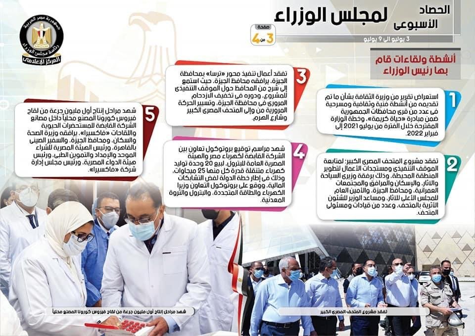 وبشأن الأنشطة التي قام بها السيد رئيس مجلس الوزراء، فبحسب التقرير، شملت استعراض تقرير من وزيرة الثقافة بشأن ما تم تقديمه من أنشطة فنية وثقافية ومسرحية فى عدد من قرى محافظات الجمهورية ضمن مبادرة “حياة كريمة”، وخطة الوزارة المقترحة خلال الفترة من يوليو 2021 إلى فبراير 2022، كما تفقد سيادته مشروع المتحف المصري الكبير؛ لمتابعة الموقف التنفيذي ومستجدات الأعمال لتطوير المنطقة المحيطة، وذلك برفقة وزيري السياحة والآثار، والإسكان والمرافق والمجتمعات العمرانية، ومحافظ الجيزة، والأمين العام للمجلس الأعلى للآثار، ومساعد الوزير للشئون الأثرية بالمتحف، وعدد من قيادات ومسئولي المتحف، بالإضافة إلى تفقد أعمال تنفيذ محور “ترسا” بمحافظة الجيزة، يرافقه محافظ الجيزة، حيث استمع إلى شرح من المحافظ حول الموقف التنفيذي للمشروع، ودوره فى تخفيف الازدحام المروري في محافظة الجيزة، وتسيير الحركة المرورية من وإلى المتحف المصري الكبير وشارع الهرم.، في حين شهد سيادته مراحل إنتاج أول مليون جرعة من لقاح فيروس كورونا المصنع محلياً داخل مصانع الشركة القابضة للمستحضرات الحيوية واللقاحات “فاكسيرا”، يرافقه وزيرة الصحة والسكان، ومحافظ الجيزة، والسفير الصيني بالقاهرة، ورئيس الهيئة المصرية للشراء الموحد والإمداد والتموين الطبي، ورئيس هيئة الدواء المصرية، ورئيس مجلس إدارة شركة “فاكسيرا”.