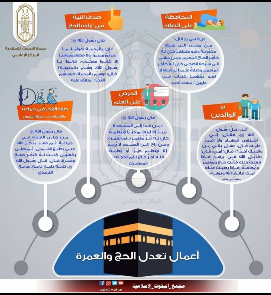 أكد مجمع البحوث الإسلامية عبر صفحته الرسمية بموقع التواصل الإجتماعي فيسبوك، أن هناك بعض الأعمال التي إذا قام بها المسلم تعدل الحج والعمرة، ومن هذه الأعمال:
