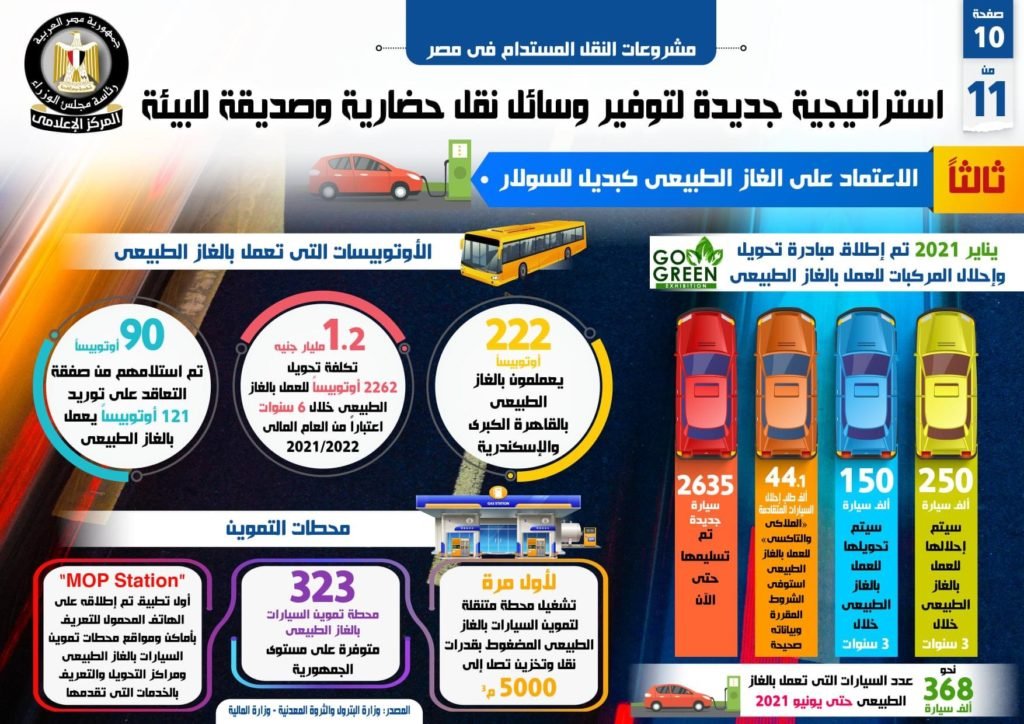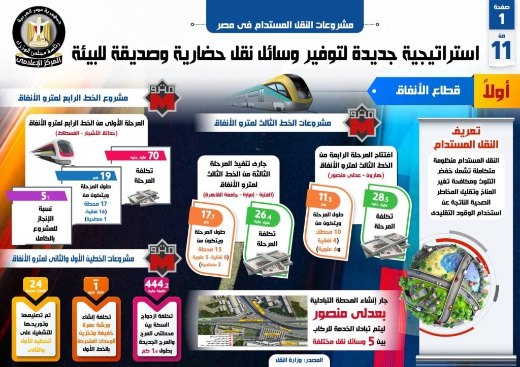 وفي هذا الصدد نشر المركز الإعلامي لمجلس الوزراء تقريراً تضمن إنفو جرافات تسلط الضوء على مشروعات النقل المستدام في مصر، والتي تأتي ضمن الاستراتيجية الجديدة للدولة لتوفير وسائل نقل حضارية وصديقة للبيئة.