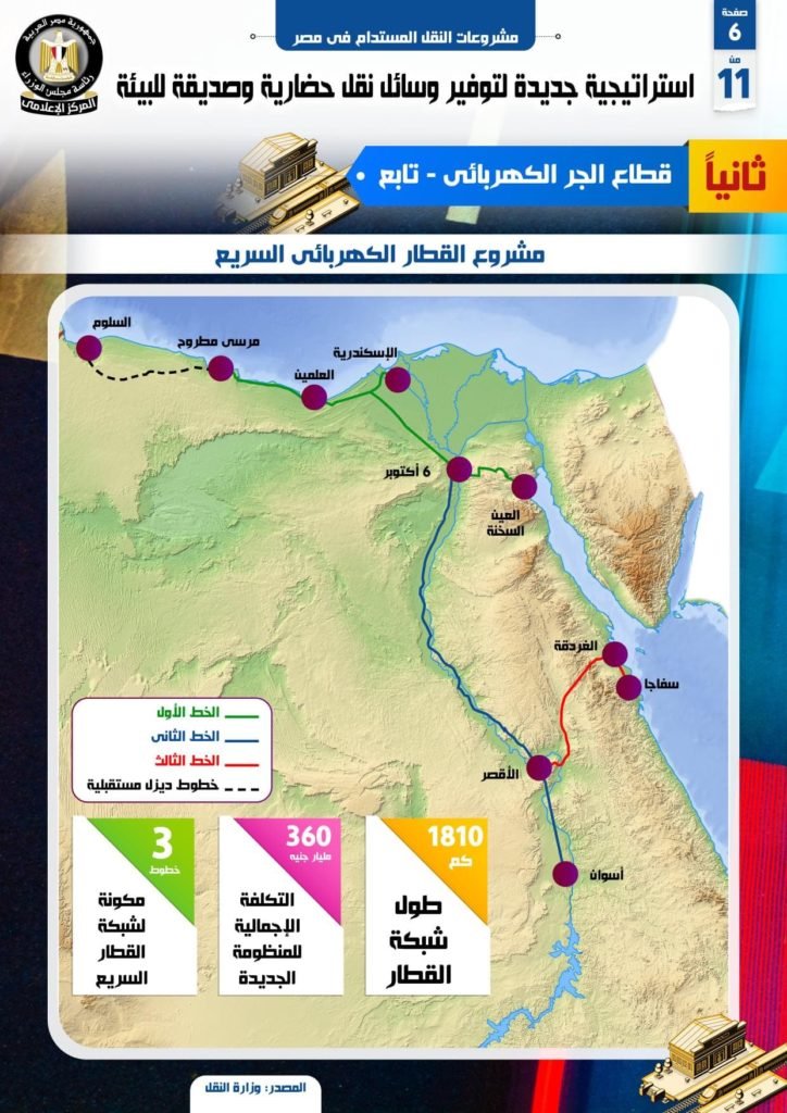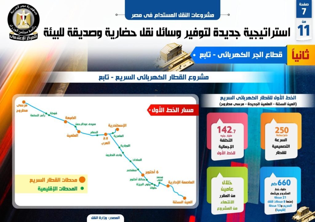 واستعرض التقرير أبرز ملامح الخط الأول من مشروع القطار الكهربائي السريع (العين السخنة، العلمين الجديدة، مرسى مطروح)، والذي تبلغ سرعته التصميمية نحو 250 كم/ ساعة للقطار، وتصل تكلفته الإجمالية لنحو ١٤2,٧ مليار جنيه، ويشمل 21 محطة منها 8 محطات للنقل السريع و13 محطة إقليمية، وذلك بطول 660 كم، ومن المقرر الانتهاء منه خلال عامين.