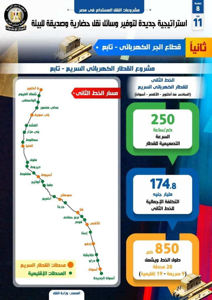 وبالنسبة للخط الثاني من مشروع القطار الكهربائي السريع، (السادس من أكتوبر، الأقصر، أسوان)، أوضح التقرير أن سرعته التصميمية تبلغ 250 كم/ ساعة، وتصل تكلفته الإجمالية لنحو ١٧٤,٨ مليار جنيه، ويشمل ٢٨ محطة منها ٩ محطات سريعة و١٩ محطة إقليمية، وذلك بطول ٨٥٠ كم.