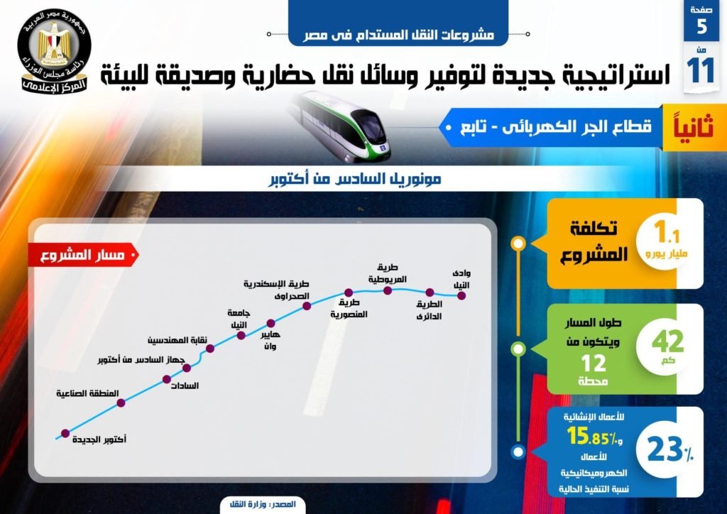 كما تضم مشروعات الجر الكهربائي، مونوريل السادس من أكتوبر، والذي تبلغ تكلفته 1.1 مليار يورو، ويتكون من 12 محطة بطول 42 كم، في حين بلغت نسبة التنفيذ الحالية للأعمال الإنشائية 23%، وللأعمال الكهروميكانيكية 15.85%.
