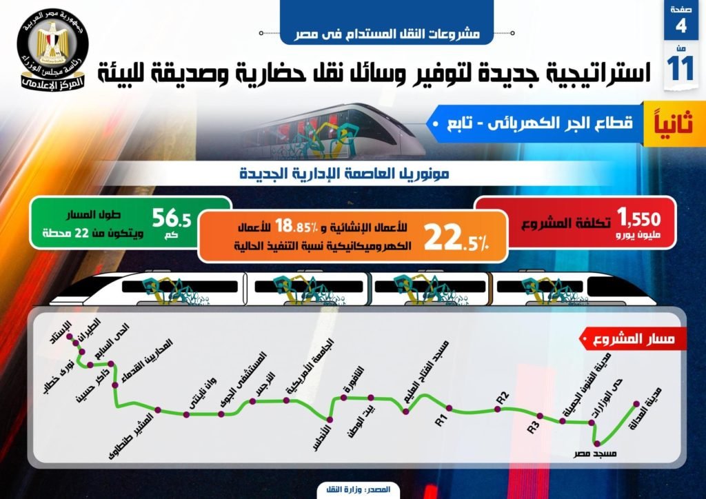 واستكمالاً لمشروعات الجر الكهربائي، أشار التقرير إلى مونوريل العاصمة الإدارية الجديدة، والذي تبلغ تكلفته 1550 مليون يورو، ويتكون من 22 محطة بطول 56.5 كم، فيما بلغت نسبة التنفيذ الحالية للأعمال الإنشائية 22.5%، وللأعمال الكهروميكانيكية 18.85%.