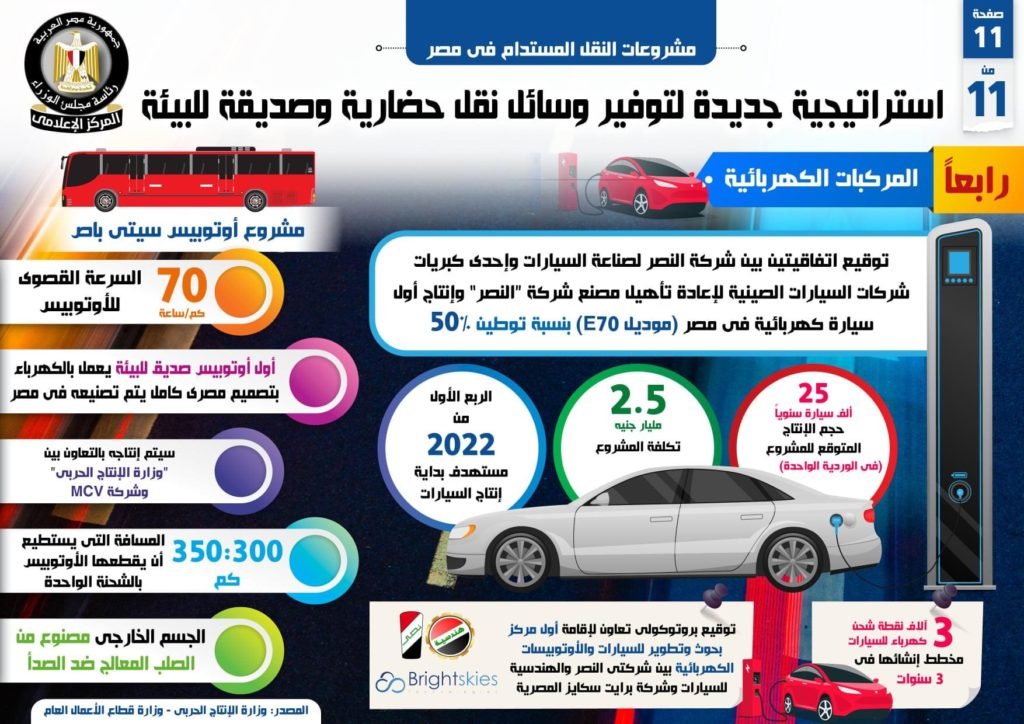 وتناول التقرير الحديث عن محور المركبات الكهربائية كأحد أدوات الدولة لتوفير وسائل نقل حضارية وصديقة للبيئة، لافتاً إلى أنه تم توقيع اتفاقيتين بين كل من شركة النصر لصناعة السيارات وإحدى كبريات شركات السيارات الصينية لإعادة تأهيل مصنع شركة “النصر”، وإنتاج أول سيارة كهربائية في مصر (موديل E70) بنسبة توطين 50%.