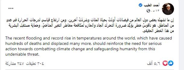 وقال فضيلته في تدوينة له بموقع التواصل الاجتماعى «فيس بوك»: إن ما تشهدُه بعض دول العالم من فيضانات أودَتْ بحياة المئات وشردَتْ آخرين، ومن ارتفاع قياسي لدرجات الحرارة في عددٍ من المناطق، هو ناقوسُ خطرٍ يؤكِّد ضرورة التحرك الجاد والحازم لمكافحة مخاطر التغيرِ المناخيِّ، وحماية مستقبل البشرية من هذا الخطر الحقيقي.