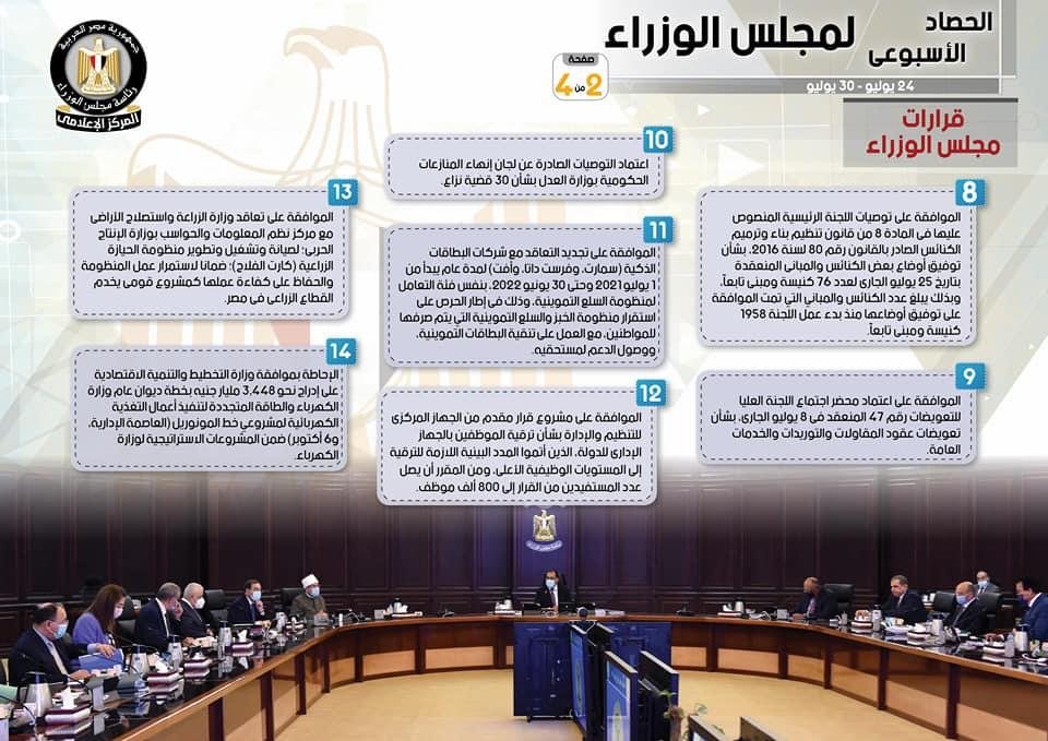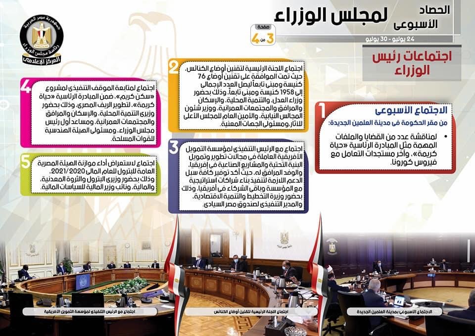 نشر المركز الإعلامي لمجلس الوزراء، تقريراً شمل إنفوجرافات سلط من خلالها الضوء على الحصاد الأسبوعي لمجلس الوزراء، وذلك خلال الفترة من 24حتى 30 يوليو 2021، والذي تضمن الموافقة على عدد من القرارات، فضلاً عن الاجتماعات واللقاءات التي عقدها الدكتور مصطفى مدبولي، رئيس مجلس الوزراء، بالإضافة إلى ما قام به من أنشطة.