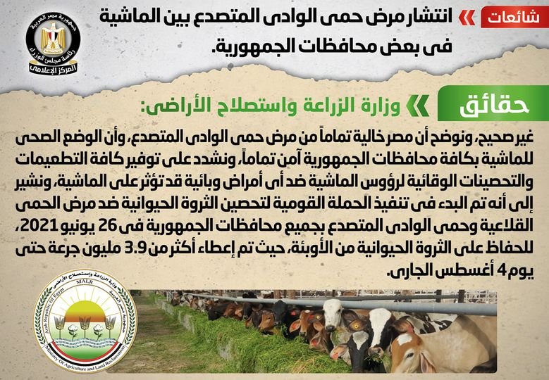 وقد قام المركز الإعلامي لمجلس الوزراء بالتواصل مع وزارة الزراعة واستصلاح الأراضي، والتي نفت تلك الأنباء، مُؤكدةً أنه لا صحة لانتشار مرض حمى الوادي المتصدع بين الماشية في أي من محافظات الجمهورية، مُوضحةً أن مصر خالية تماماً من مرض حمى الوادي المتصدع، وأن الوضع الصحي للماشية بكافة محافظات الجمهورية آمن تماماً.