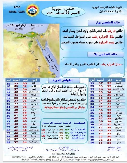 وأضاف خبراء هيئة الأرصاد، أنَّه يسود غدا طقس شديد الحرارة على جنوب سيناء وجنوب الصعيد، بينما يكون معتدل الحرارة ليلًا رطب على القاهرة الكبرى وباقي الأنحاء.