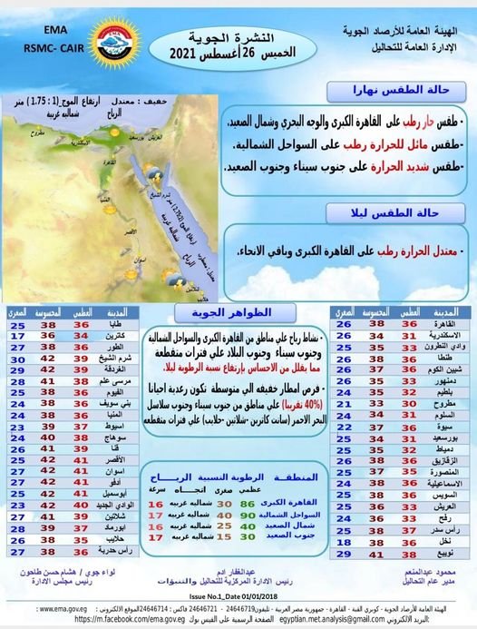 نشرت الهيئة العامة للأرصاد الجوية المصرية، على صفحتها الرسمية على “فيسبوك”، تفاصيل حالة الطقس المتوقعة غدا الخميس.