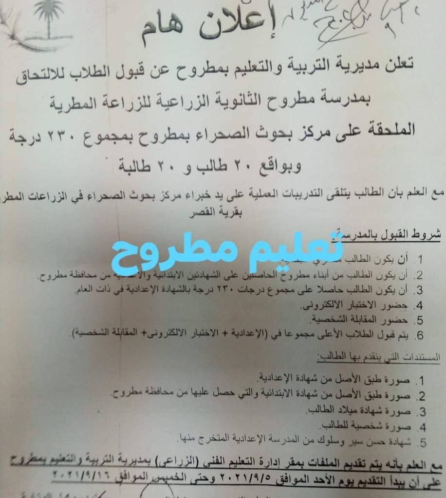أعلن اعاطف سلامة وكيل وزارة التربية والتعليم بمحافظة مطروح اليوم الجمعة الثالث من سبتمبر ٢٠٢١ عن القبول الطلاب للالتحاق بمدرسة مطروح الثانوية للزراعة المطرية الملحقة علي مركز بحوث الصحراء بمطروح بمجموع ٢٣٠ درجة موضحاً أن تقديم الطلبات بداية من بعد غد الأحد ٥ سبتمبر وحتي يوم الخميس ١٦ سبتمبر ٢٠٢١ بمقر إدارة التعليم الزراعي بديوان عام تعليم مطروح
