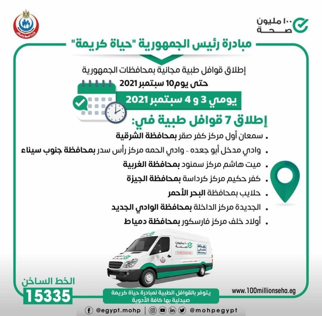 أعلنت وزارة الصحة والسكان المصرية، عن إطلاق 7 قوافل طبية ضمن مبادرة رئيس الجمهورية حياة كريمة،