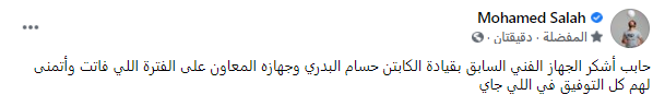 وكتب صلاح عبر صفحته على موقع التواصل الاجتماعى فيس بوك،”حابب أشكر الجهاز الفني السابق بقيادة الكابتن حسام البدري وجهازه المعاون على الفترة اللي فاتت وأتمنى لهم كل التوفيق في اللي جاي”.