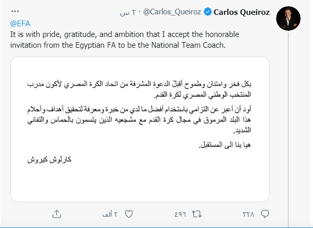 ,كتب كارلوس كيروش عبر حسابه الرسمي على شبكة تويتر باللغتين العربية والإنجليزية، في أول تعليق له عقب توليه مهمة تدريب منتخب مصر: “بكل فخر وامتنان وطموح، أقبل الدعوة المشرفة من اتحاد الكرة المصرى لأكون مدرب المنتخب الوطنى المصرى لكرة القدم”.