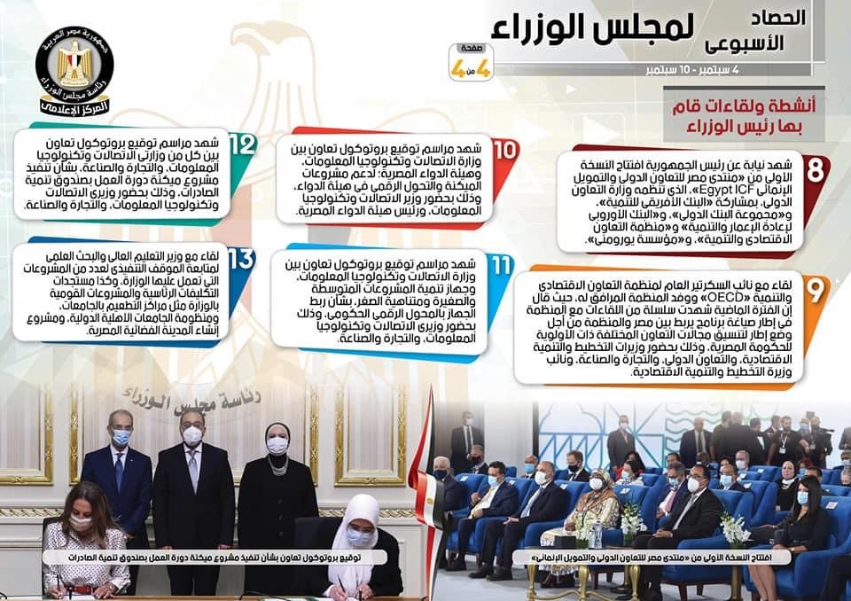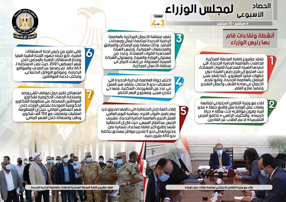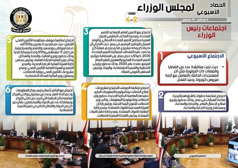 نشر المركز الإعلامي لمجلس الوزراء، تقريراً شمل إنفوجرافات سلط من خلالها الضوء على الحصاد الأسبوعي لمجلس الوزراء، وذلك خلال الفترة من 4 سبتمبر حتى 10 سبتمبر 2021، والذي تضمن الموافقة على عدد من القرارات، فضلاً عن الاجتماعات واللقاءات التي عقدها الدكتور مصطفى مدبولي، رئيس مجلس الوزراء، بالإضافة إلى ما قام به من أنشطة.