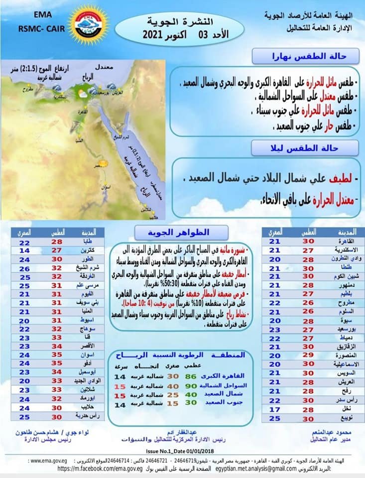 وأشارت الهيئة العامة للأرصاد الجوية، إلى أن الطقس سيكون معتدلا على السواحل الشمالية، مائلًا للحرارة على جنوب سيناء.