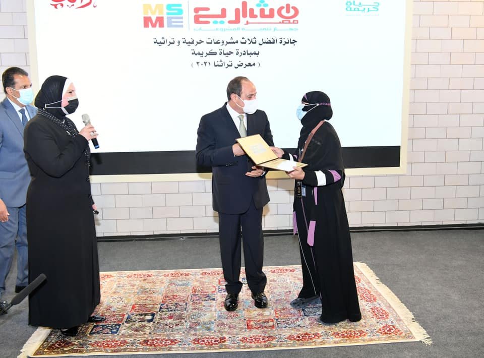 سلم الرئيس عبد الفتاح السيسي، جوائز مالية لأفضل ثلاثة مشروعات حرفية وتراثية للقرى على مستوى الجمهورية، على هامش افتتاحه اليوم فعاليات معرض تراثنا للحرف اليدوية، المقام حتى 15 أكتوبر، في مركز مصر للمعارض الدولية بالتجمع الخامس.