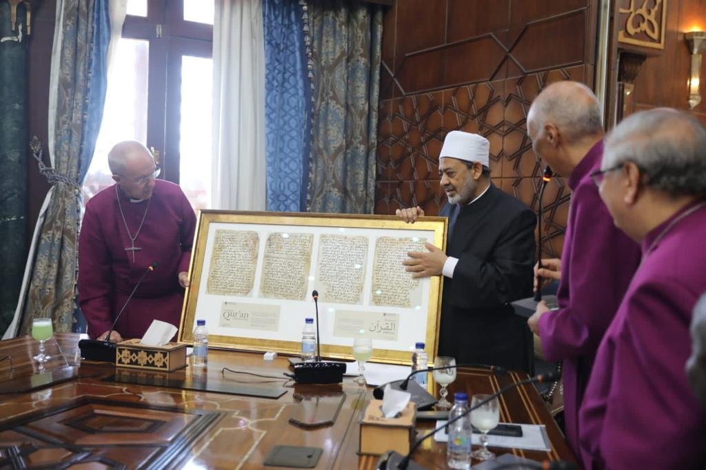 في ختام اللقاء، أهدى فضيلة الإمام الأكبر إلى السيد جاستن ويلبي، رئيس أساقفة كانتربري بإنجلترا ذاكرة الأزهر ونسخة فاخرة من القرآن الكريم، كما أهدى السيد جاستن ويلبي إلى فضيلة الإمام الأكبر مخطوطة قديمة “طبق الأصل” من القرآن الكريم تعود إلى القرن السادس، وهي النسخة الوحيدة من نوعها في العالم وتوجد في جامعة برمنجهام بإنجلترا.