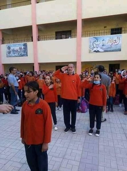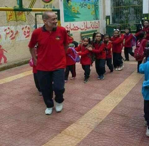 شارك مدير إحدى المدارس بالجيزة الطلاب بارتداء الزي المدرسي ، وقام بحضور الطابور الصباحي معهم والأنشطة المدرسية.