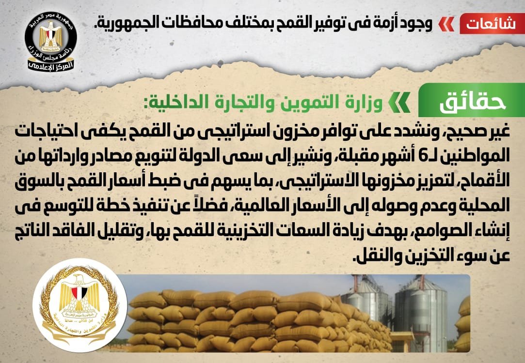 كشف المركز الإعلامى لمجلس الوزراء إنه فى ضوء ما تردد من أنباء بشأن وجود أزمة في توفير القمح بمختلف محافظات الجمهورية، تواصل المركز مع وزارة التموين والتجارة الداخلية، والتي نفت تلك الأنباء، مُؤكدةً أنه لا صحة لوجود أزمة في توفير القمح بأي من محافظات الجمهورية، مُشددةً على توافر مخزون استراتيجي من القمح يكفي احتياجات المواطنين لـ 6 أشهر مقبلة.