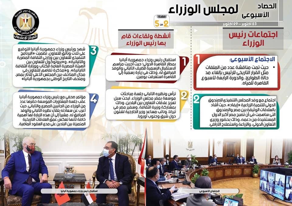وبشأن الأنشطة التي قام بها السيد رئيس مجلس الوزراء، فبحسب التقرير، شملت استقبال سيادته رئيس وزراء جمهورية ألبانيا بمطار القاهرة الدولي؛ حيث أجريت مراسم الاستقبال الرسمية للضيف الألباني والوفد المرافق له، وذلك في زيارة رسمية إلى القاهرة استغرقت يومين. كما ترأس ونظيره الألباني جلسة مباحثات موسعة بمقر مجلس الوزراء، لبحث سبل تعزيز علاقات التعاون بين البلدين، وذلك بمشاركة وزيرة الثقافة، وسفير مصر في تيرانا، ونائب مساعد وزير الخارجية لشئون دول شرق وجنوب أوروبا