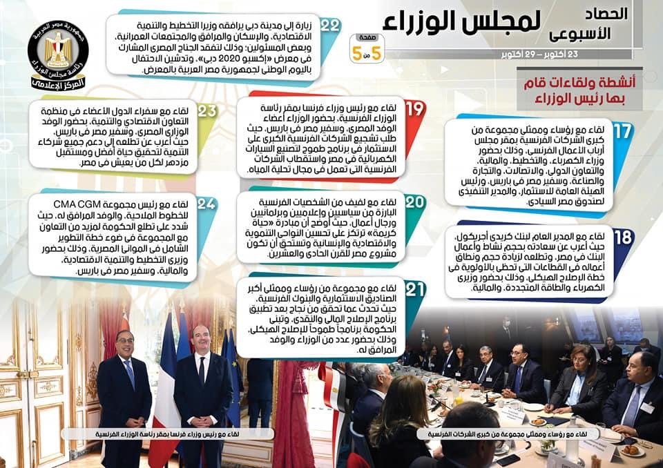 أما بشأن اللقاءات التي عقدها الدكتور مصطفى مدبولي رئيس مجلس الوزراء على مدار الأسبوع، أظهر التقرير، لقاء سيادته مع رؤساء وممثلي مجموعة من كبرى الشركات الفرنسية بمقر مجلس أرباب الأعمال الفرنسي، وذلك بحضور وزراء الكهرباء، والتخطيط، والمالية، والتعاون الدولي، والاتصالات، والتجارة والصناعة، وسفير مصر في باريس، ورئيس الهيئة العامة للاستثمار، والمدير التنفيذي لصندوق مصر السيادي، فضلاً عن لقاء مع المدير العام لبنك كريدي أجريكول، حيث أعرب عن سعادته بحجم نشاط وأعمال البنك في مصر، وتطلعه لزيادة حجم ونطاق أعماله في القطاعات التي تحظى بالأولوية في خطة الإصلاح الهيكلي، وذلك بحضور وزيري الكهرباء والطاقة المتجددة، والمالية