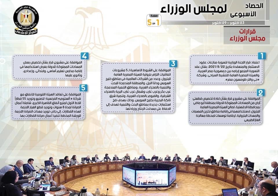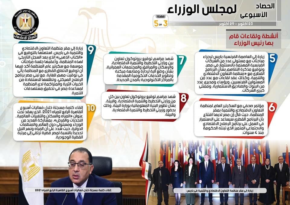 نشر المركز الإعلامي لمجلس الوزراء، تقريراً شمل إنفوجرافات سلط من خلالها الضوء على الحصاد الأسبوعي لمجلس الوزراء، وذلك خلال الفترة من 23 حتى 29 أكتوبر 2021، والذي تضمن الموافقة على عدد من القرارات، فضلاً عن الاجتماعات واللقاءات التي عقدها الدكتور مصطفى مدبولي، رئيس مجلس الوزراء، بالإضافة إلى ما قام به من أنشطة.