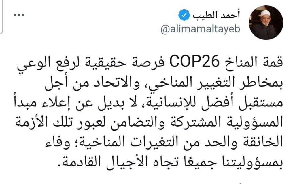 وأضاف الإمام الأكبر عبر تغريدة على صفحته الرسمية على موقع التدوينات القصيرة “تويتر” باللغتين العربية والإنجليزية: “لا بديل عن إعلاء مبدأ المسؤولية المشتركة والتضامن لعبور تلك الأزمة الخانقة والحد من التغيرات المناخية؛ وفاء بمسؤوليتنا جميعًا تجاه الأجيال القادمة”.
