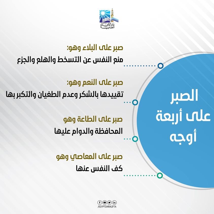 نشرت دار الإفتاء المصرية، عبر صفحتها الرسمية على موقع التواصل الاجتماعى “فيس بوك”، انفوجرافًا أوضحت من خلاله أنواع الصبر وكيفية الصبر، قائلة: “إن الصبر على أربعة أوجه هي :”صبر على البلاء وصبر على النعم، وصبر على الطاعة، وصبر على المعاصى”.