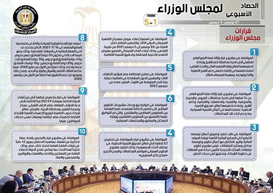 وجاء في التقرير أنه تم إصدار عدد من القرارات، تشمل الموافقة على مشروع قرار بإزالة صفة النفع العام لقطعتي أرض ناحية محافظة كفر الشيخ وإعادة تخصيصهما لصالح وزارة التعليم العالي والبحث العلمي؛ لاستخدامهما في إقامة جامعتي كفر الشيخ الأهلية والتكنولوجية، ومهبط للإسعاف الطائر، بالإضافة إلى الموافقة على مشروع قرار بإزالة صفة النفع العام عن 14 قطعة أرض ناحية محافظات: الفيوم، والبحيرة، والمنوفية، والغربية، والدقهلية، والشرقية، وكفر الشيخ، وإعادة تخصيصها لصالح صندوق التنمية الحضرية، لاستخدامها في أغراض التنمية العمرانية، بما يخدم أبناء تلك المحافظات، فضلاً عن الموافقة على مشروع قرار بالموافقة على تخصيص 23 قطعة أرض لصالح صندوق التنمية الحضرية، في مختلف أنحاء الجمهورية، وذلك لتنفيذ مشروع التطوير العمراني لعواصم المحافظات والمدن الكبرى “سكن لكل المصريين”، وكذلك الموافقة على استمرار إعفاء عروض مهرجان القاهرة السينمائى الدولي الثالث والأربعين المقام خلال الفترة من 26 نوفمبر إلى 5 ديسمبر 2021 من ضريبة الملاهي، وذلك لإثراء الفكر السينمائي المصري بعروض الأفلام الأجنبية المختلفة وتحقيق التنمية الثقافية، كما تمت الموافقة على مقترح استضافة مصر لمؤتمر الأطراف الثالث والعشرين للدول المشاركة في اتفاقية حماية بيئة البحر المتوسط من التلوث، المقرر عقده في ديسمبر 2023.