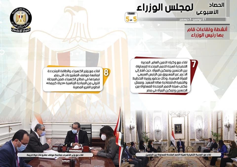 وبشأن اللقاءات التي عقدها الدكتور مصطفى مدبولي رئيس مجلس الوزراء على مدار الأسبوع، جاء في التقرير، عقد سيادته لقاء مع وكيلة الأمين العام، المديرة التنفيذية لهيئة الأمم المتحدة للمساواة بين الجنسين وتمكين المرأة، حيث أشار إلى الدعم غير المسبوق من الرئيس السيسي للمرأة المصرية، وذلك بحضور وزيرة التخطيط والتنمية الاقتصادية هالة السعيد، وممثل مكتب هيئة الأمم المتحدة للمساواة بين الجنسين وتمكين المرأة في مصر، فضلاً عن لقاء مع وزير الكهرباء والطاقة المتجددة لمتابعة موقف المشروعات التي يتم تنفيذها في قطاع الكهرباء ضمن المرحلة الأولى من المبادرة الرئاسية “حياة كريمة” لتطوير القرى المصرية.