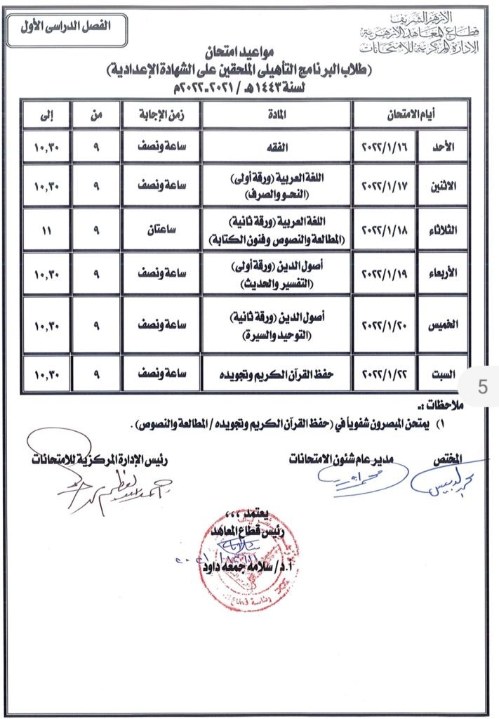 كما أفصح قطاع المعاهد الأزهرية عن جدول امتحانات سنوات النقل الإعدادى، ويبدأ طلاب الصفين الأول والثانى الإعدادى امتحاناتهم يوم السبت 8 يناير ويختتمون الامتحانات يوم الخميس 13 يناير، فيما يبدأ طلاب البرنامج التأهيلى الملتحقين بالشهادة الإعدادية يوم الأحد 16 يناير ويختتمون امتحاناتهم يوم السبت 22 يناير.