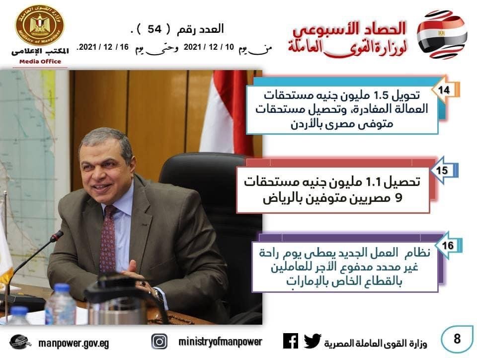 كما نجح مكتب التمثيل العمالي التابع لوزارة القوى العاملة، بالقنصلية العامة المصرية بالعاصمة الرياض بالمملكة العربية السعودية، في الحصول على مستحقات 9 مواطنين مصريين، بلغت 277 ألفاً و 862 ريالًا سعوديًا، أي ما يعادل مليون و164 ألف و241 جنيها تقريبا.