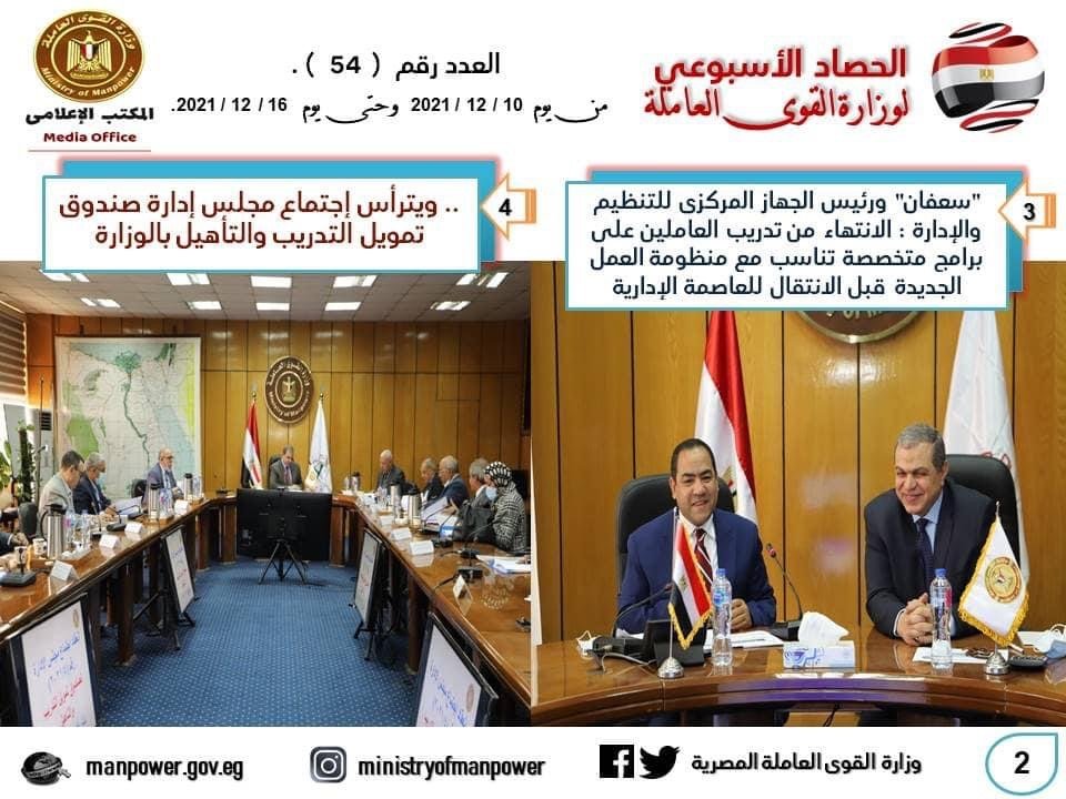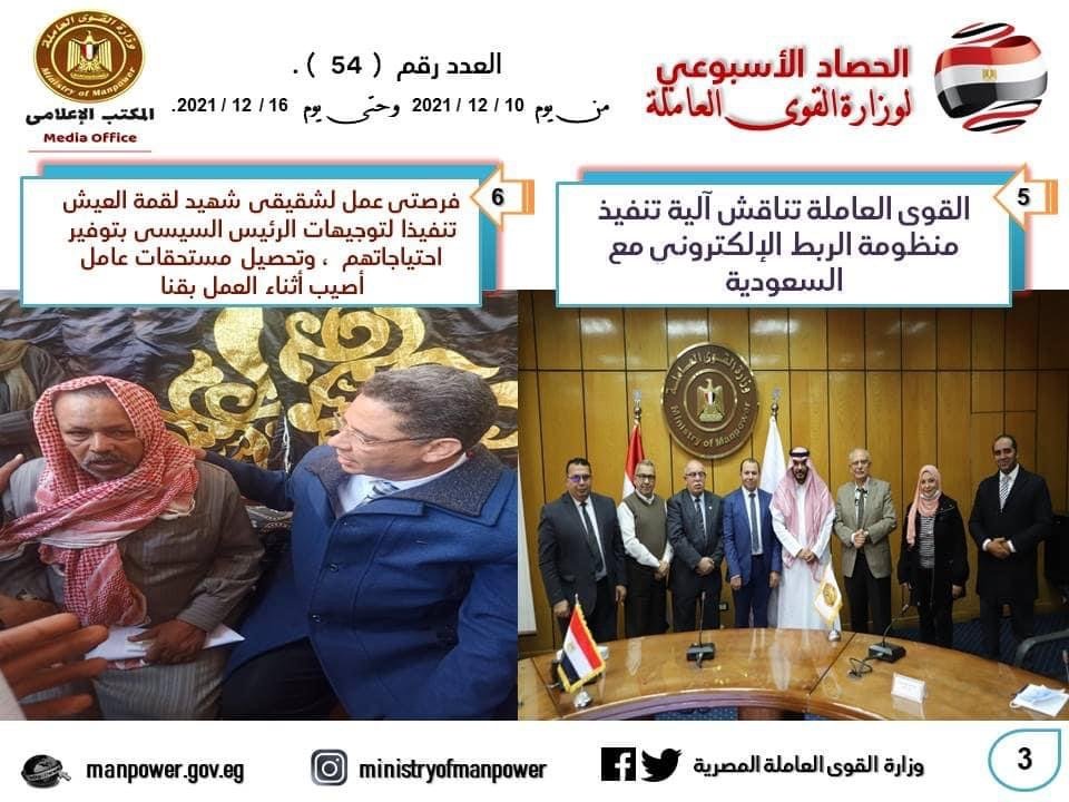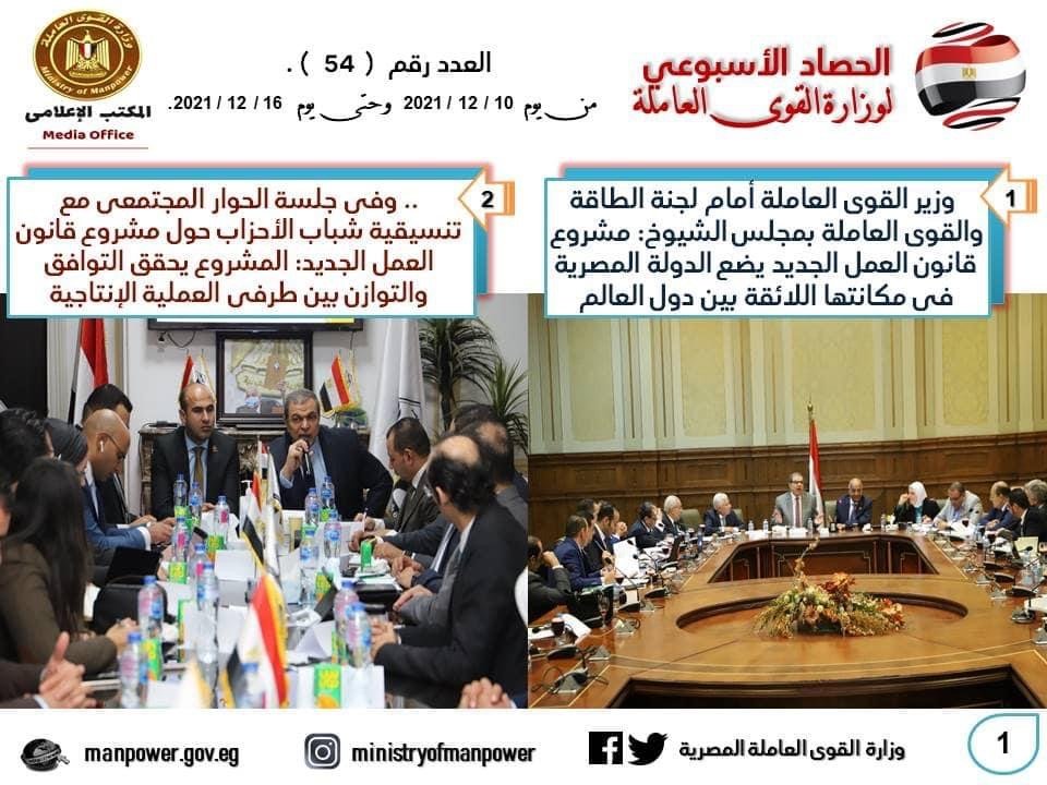 شهد حصاد الأسبوع الحالي، في وزارة القوى العاملة العديد من الأحداث المهمة خلال الفترة – من 10 إلى 16 ديسمبر الجاري- منها وزير القوى العاملة يشارك فى لجنة الطاقة والقوى العاملة بمجلس الشيوخ ويعلن: مشروع قانون العمل الجديد يضع الدولة المصرية في مكانتها اللائقة بين دول العالم ، ويحضر جلسة الحوار المجتمعي التى نظمتها تنسيقية شباب الأحزاب والسياسيين ، ويترأس إجتماع مجلس إدارة صندوق تمويل التدريب والتأهيل بالوزارة ، وتعيين 10701 شابا في 7 محافظات ، منهم 229 من القادرين باختلاف، وتحصيل 2.8 مليون جنه مستحقات العمالة المصرية بالأردن والسعودية .