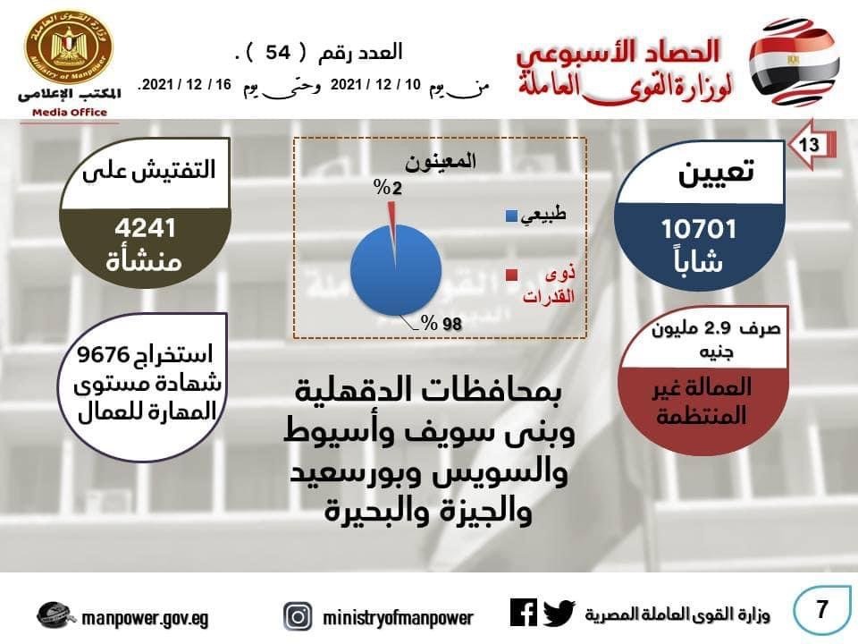 وشمل حصاد الأسبوع تعيين 10701 شابا في 7 محافظات ، منهم 229 من القادرين باختلاف ، وصرف منح للرعاية الاجتماعية والصحية للعمالة غير المنتظمة المسجلة بمديريات القوى العاملة بمحافظات بنى سويف ، وأسيوط ، والسويس ، وبورسعيد ، والبحيرة ، والجيزة ، والدقهلية ، بلغت 2 مليون و 992 ألفاً و 922 جنيها ، والتفتيش على 4241 منشأة لتطبيق أحكام القانون، فضلاً عن استخراج 9676 شهادة قياس مستوى المهارة ، ورخصة مزاولة الحرفة لـ 9676 عاملا.
