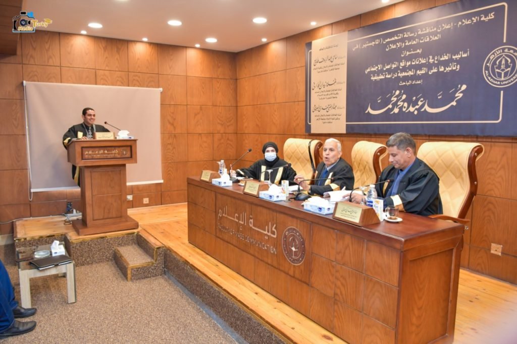 وضمت لجنة الحكم والمناقشة كلًا من الأستاذ الدكتور سامي طايع أستاذ العلاقات العامة والإعلان بكلية الإعلام جامعة القاهرة مناقشًا ورئيسًا، والأستاذة الدكتورة نهلة الحوراني أستاذ العلاقات العامة والإعلان المساعد بقسم الإعلام كلية الآداب جامعة المنصورة مشرفًا رئيسًا، والأستاذ الدكتور عبد الراضي حمدي وكيل كلية الإعلام جامعة الأزهر مناقشًا خارجيًا. والدكتور رمضان ابراهيم رئيس قسم العلاقات العامة والإعلان السابق مشرفا مساعدا.