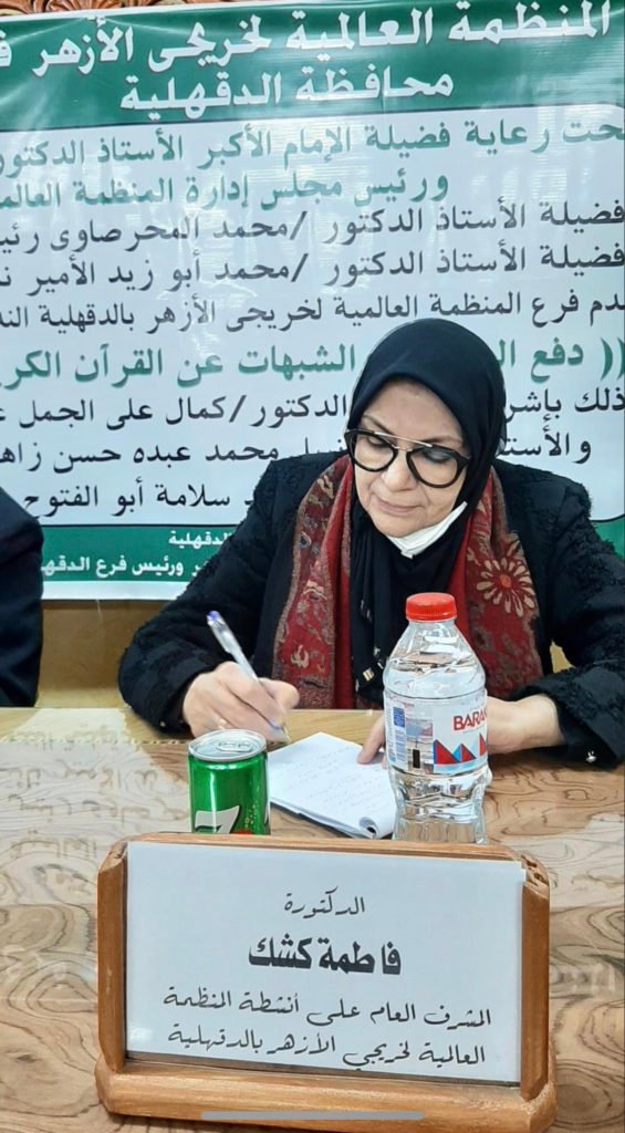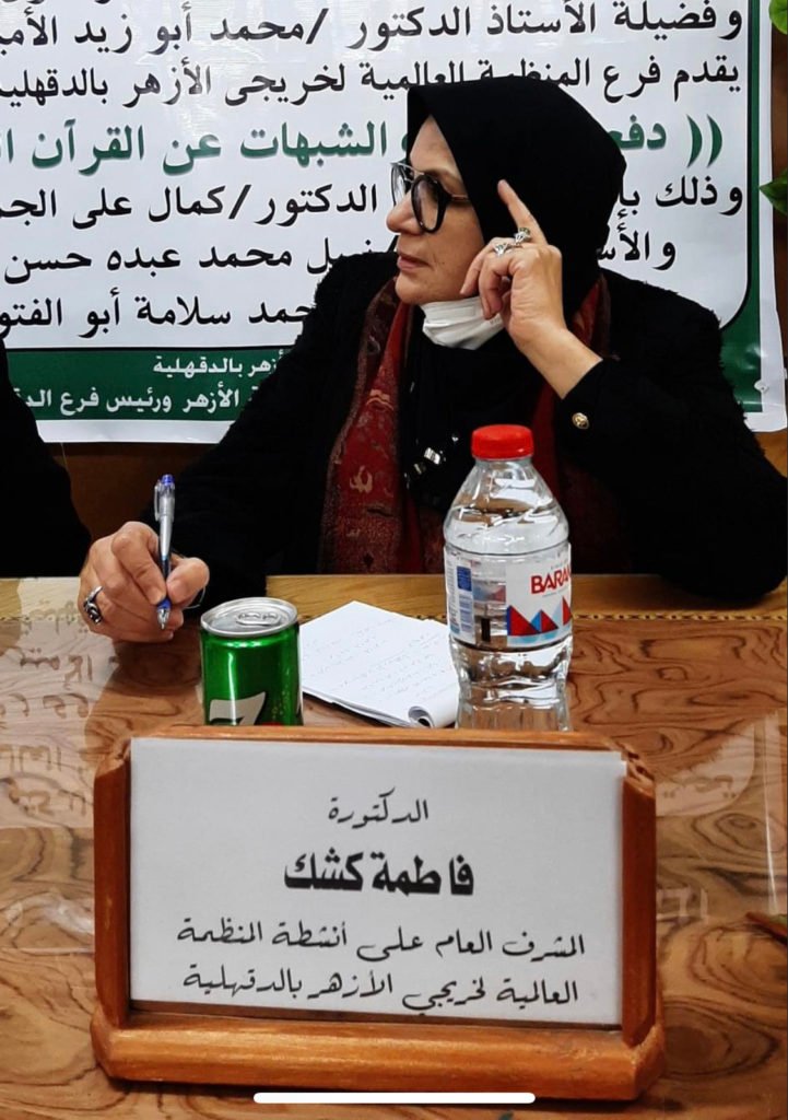 ثم تحدثت الدكتورة فاطمة كشك المشرف العام علي فرع المنظمة بالدقهلية قائلا نشكر رجال الازهر الشريف علي سعيهم علي نشر العلم الصحيح والمنهج الازهري المعتدل والمساهمة الفعالة في كافة الانشطة لتثبيت دعائم الدين الصحيح والبعد عن كل الشبهات والانحرافات الفكرية التي يبثها ويتمسك بها اعداء الدين والمتطرفين وأعداء الوطن والعمل بكل جهد لنشر صحيح المنهج وأصول العقيدة السمحة ثم دعت في نهاية اللقاء الي أهمية الحوار والنقاش الجاد والمثمر في الخروج الي أفكار متناسبة ورؤية متقاربة تعود بالنفع والخير للجميع ولوطننا العزيز
