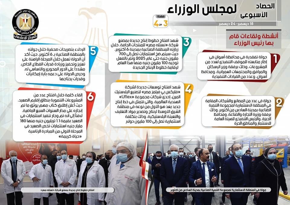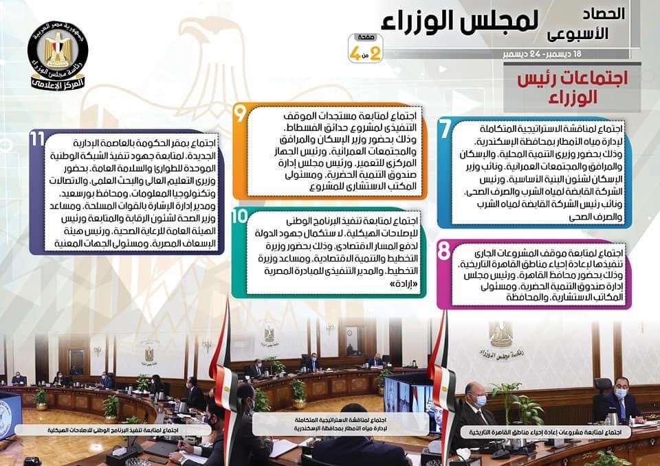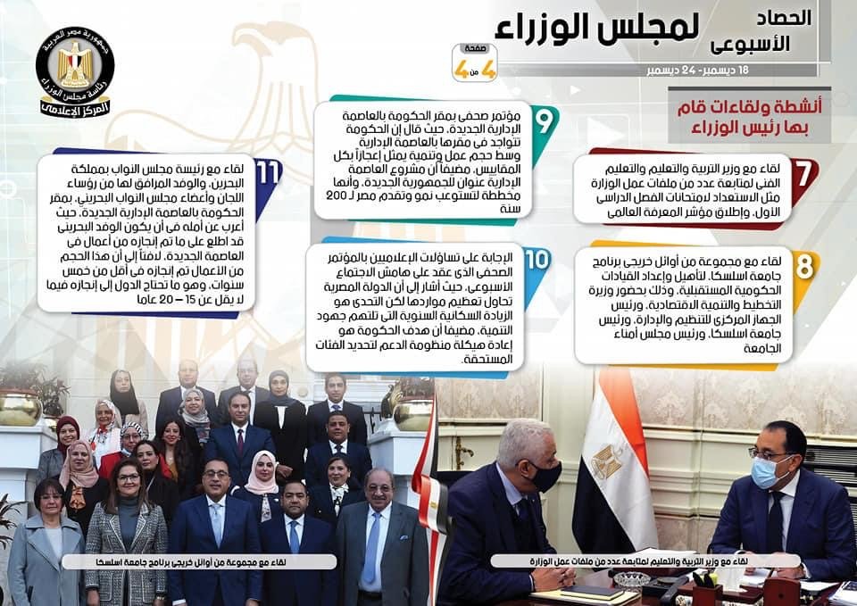 نشر المركز الإعلامي لمجلس الوزراء، تقريراً شمل إنفوجرافات سلط من خلالها الضوء على الحصاد الأسبوعي لمجلس الوزراء، وذلك خلال الفترة من 18 حتى 24 ديسمبر 2021، والذي تضمن الاجتماعات واللقاءات التي عقدها الدكتور مصطفى مدبولي، رئيس مجلس الوزراء، بالإضافة إلى ما قام به من أنشطة.