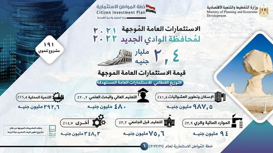 وحول خطة المواطن الاستثمارية بمحافظة الوادي الجديد أوضحت السعيد أن عدد المشروعات التنموية بالمحافظة يصل إلى 191 مشروعًا، وأن قيمة الاستثمارات العامة الموجهة لمحافظة الوادي الجديد بخطة عام 21/2022 تبلغ 2,4 مليار جنيه .