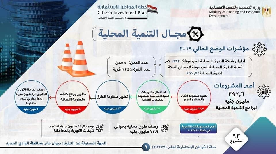 استعرضت وزارة التخطيط والتنمية الاقتصادية في تقرير صادر عنها ملامح خطة المواطن الاستثمارية لمحافظة الوادي الجديد لعام 21/2022 ، وذلك في إطار مواصلة الإعلان عن خطة المواطن في كافة محافظات الجمهورية للعام الثالث على التوالي، بهدف توعية المواطنين بشأن توجهات وأولويات خطة التنمية المستدامة للعام المالي (21/2022)، ودورها في تحقيق “رؤية مصر 2030”.