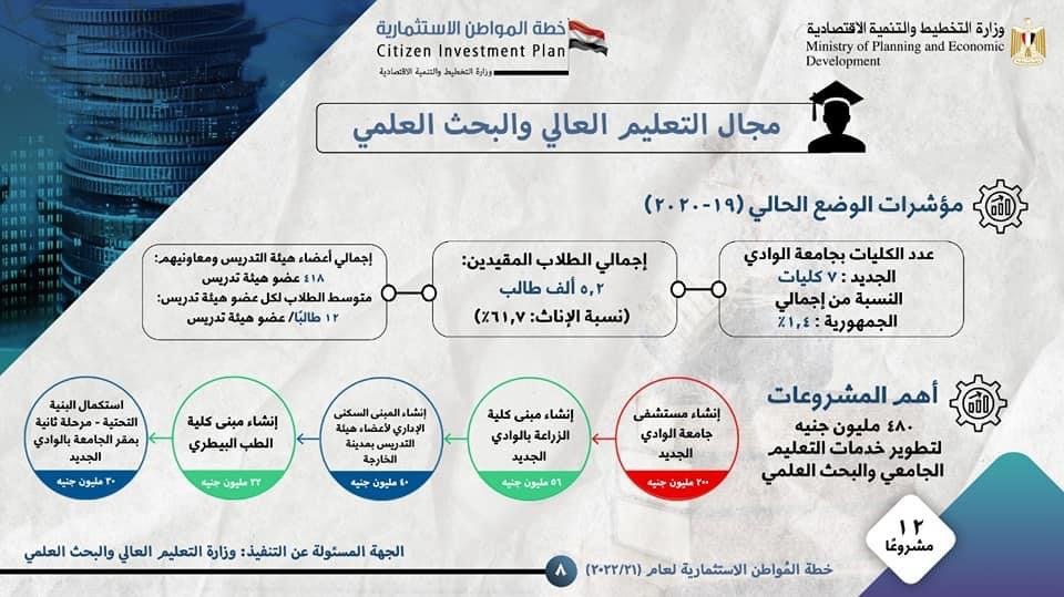 وفيما يتعلق قطاع التعليم العالي والبحث العلمي بالمحافظة أشار التقرير إلى أن إجمالي عدد الطلاب بالمحافظة المقيدين بالجامعات يبلغ نحو 5,2 ألف طالب وتصل نسبة الإناث من عدد الطلاب إلى 61,7%، موضحًا أهم مشروعات القطاع بخطة عام 21/2022 والتي يبلغ عددها 12 مشروعا منها إنشاء مستشفي جامعة الوادي الجديد، إنشاء مبنى كلية الزراعة بالوادي الجديد، إنشاء مبنى كلية الطب البيطري، إلى جانب استكمال البنية التحتية ـ مرحلة ثانية بمقر الجامعة بالوادي الجديد.