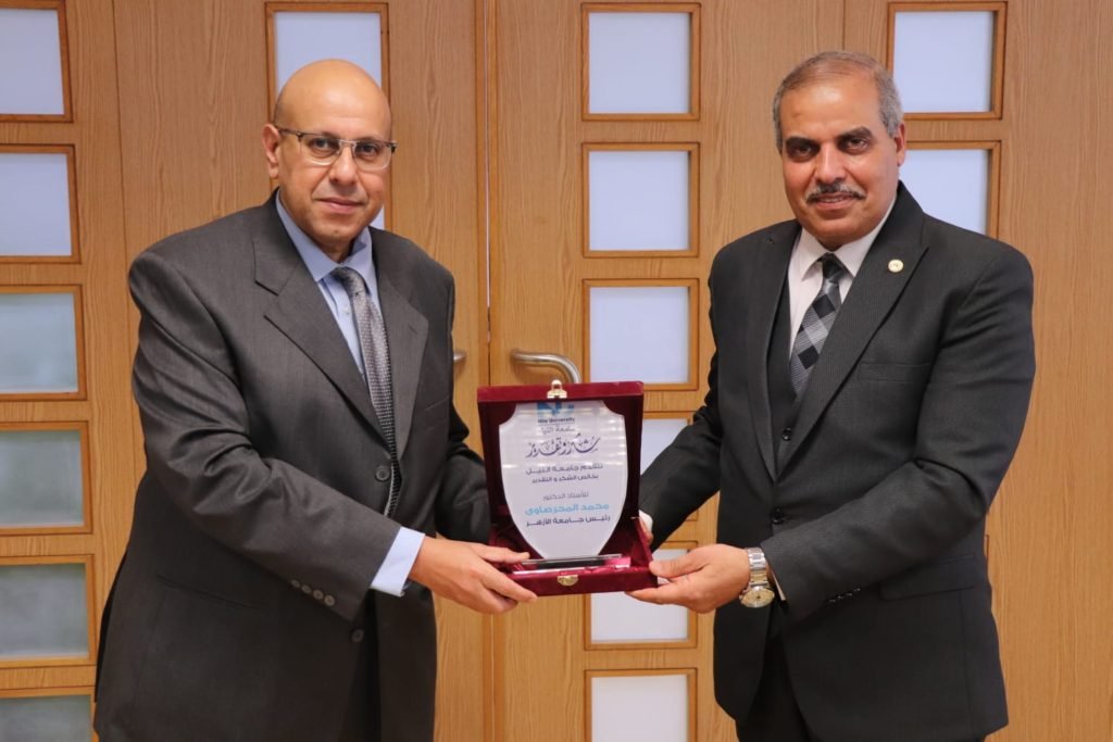 في إطار حرص مؤسسة الأزهر الشريف جامعًا وجامعةً برئاسة فضيلة الإمام الأكبر الدكتور أحمد الطيب، شيخ الأزهر الشريف، على الانفتاح والتعاون مع جميع مؤسسات الدولة الوطنية؛ قام فضيلة الدكتور محمد المحرصاوي، رئيس جامعة الأزهر، اليوم الاثنين، يرافقه كل من: الدكتور محمود صديق، نائب رئيس الجامعة للدراسات العليا والبحوث، والدكتور محمد الشربيني، نائب رئيس الجامعة لشئون التعليم والطلاب، والدكتور محمد فكري خضر، نائب رئيس الجامعة لفرع البنات، والدكتور محمد جلال، عميد كلية الهندسة بقنا مستشار الجامعة للابتكار وريادة الأعمال والحاضنات التكنولوجية؛ بزيارة إلى جامعة النيل؛ تلبية للدعوة التى وجهها الدكتور وائل عقل، رئيس الجامعة.