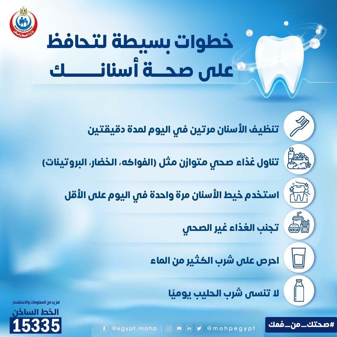 نشرت وزارة الصحة على صفحتها الرسمية على فيسبوك، خطوات بسيطة للمحافظة على صحة الأسنان