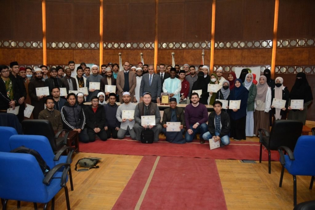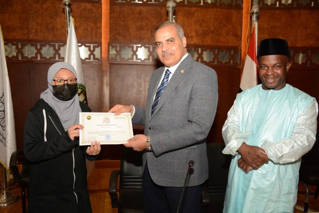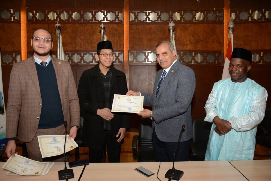 كرم فضيلة أ. د. محمد المحرصاوي، رئيس جامعة الأزهر، نائب رئيس مجلس إدارة المنظمة العالمية لخريجي الأزهر، 200 طالب وطالبة من المشاركين في الدورة التدريبية لمشروع سفراء الأزهر، التابع للمنظمة العالمية لخريجي الأزهر، والتي تضمنت «شرح كتاب الملوكي في التصريف؛ لابن يعيش»؛ لفضيلة الشيخ سيدي فوزي كوناتي، من علماء الأزهر الشريف.