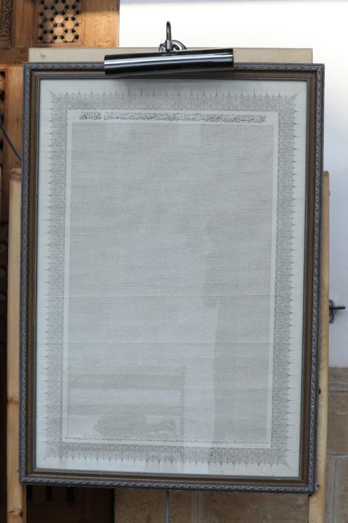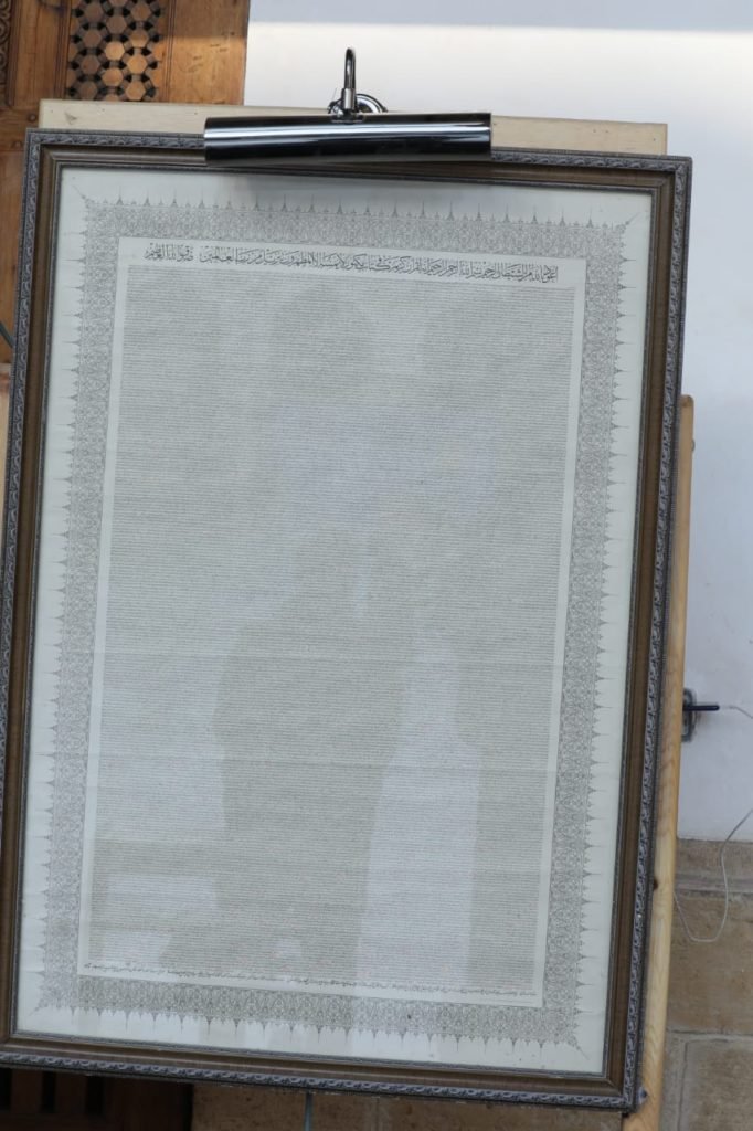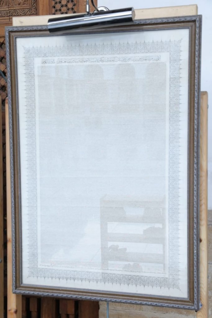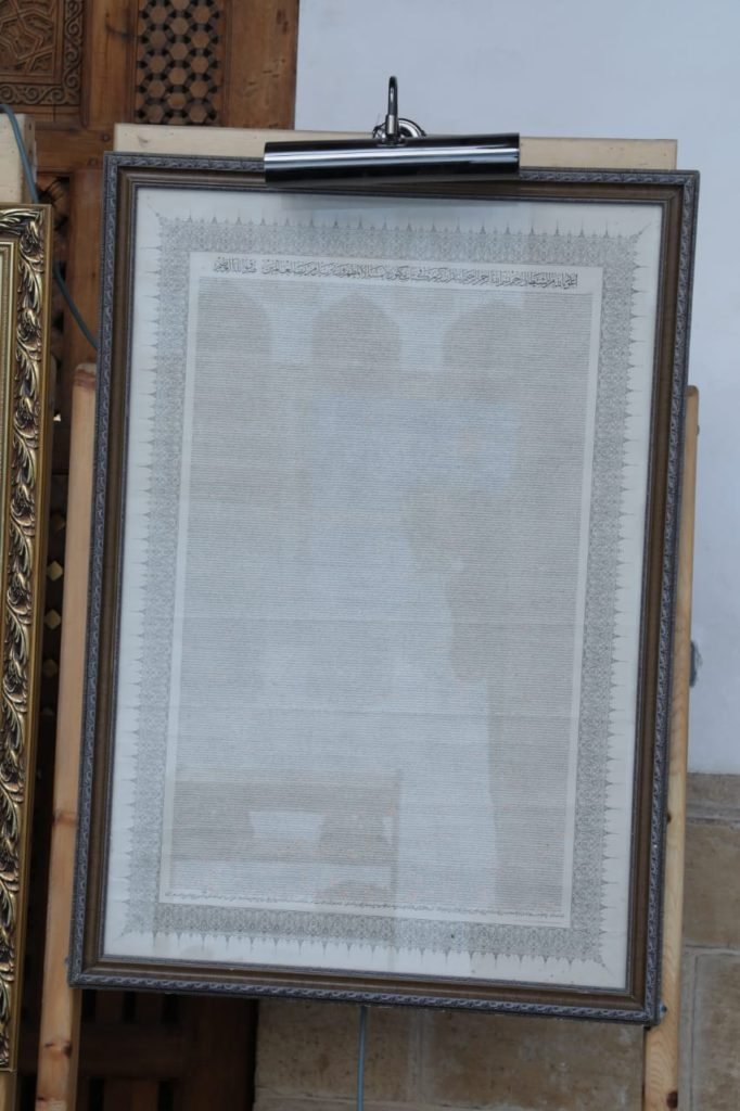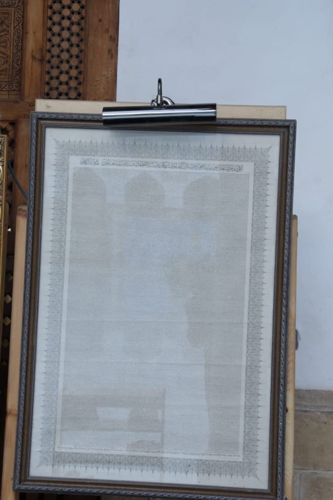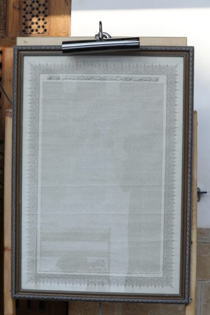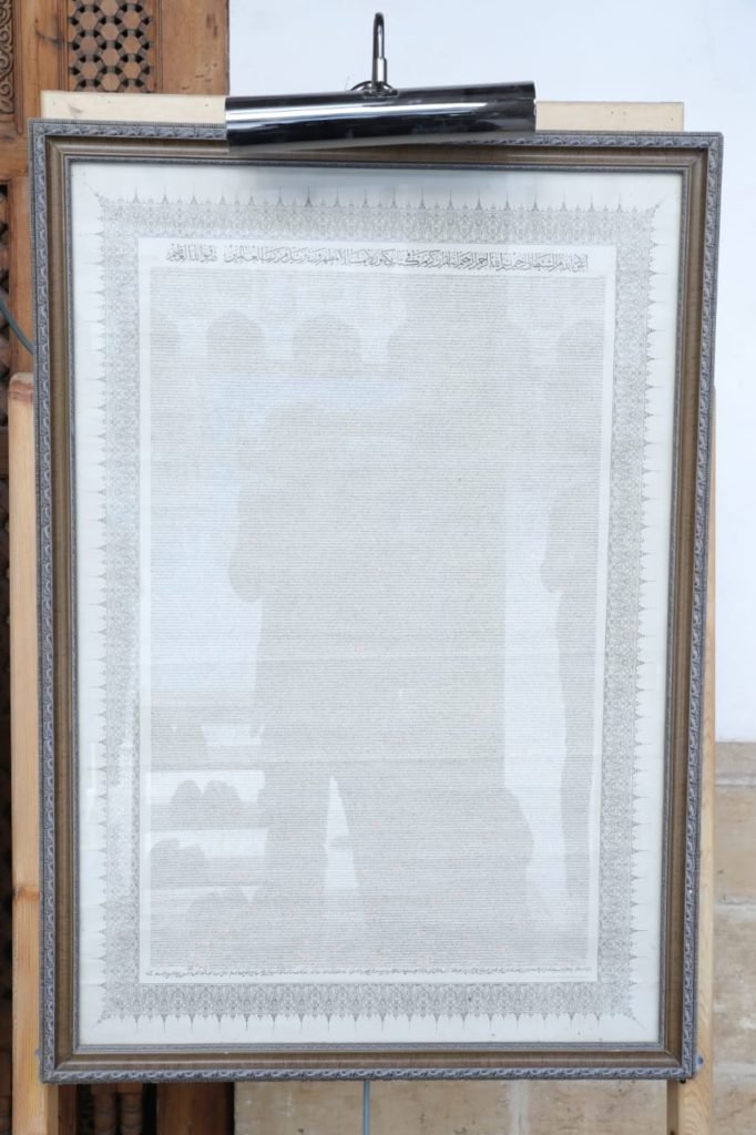 مخطوطة، تجد العين المجردة صعوبة كبيرة في فك شفرة وضوح حروفها، ففى أعلى اللوحة كتب الفنان المصري قولة تعالى بعد بسم الله الرحمن الرحيم (إنه لقرآن كريم فى كتاب مكنون لا يمسه إلا المطهرون تنزيل من رب العالمين) صدق الله العظيم”، وبالرغم من وضوح هذه الكلمات، إلا أن باقي اللوحة يصعب أن تقرأ كلماتها حتى بالعدسة المكبرة.