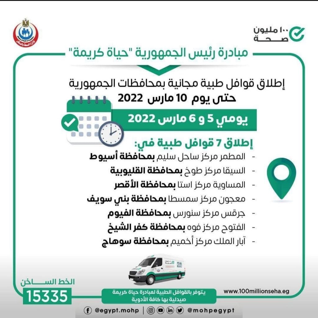 أعلنت وزارة الصحة والسكان، إطلاق 7 قوافل طبية ضمن مبادرة رئيس الجمهورية حياة كريمة، وذلك يومي 5 و 6 مارس 2022 للكشف والعلاج مجانًا في التخصصات الطبية التالية: